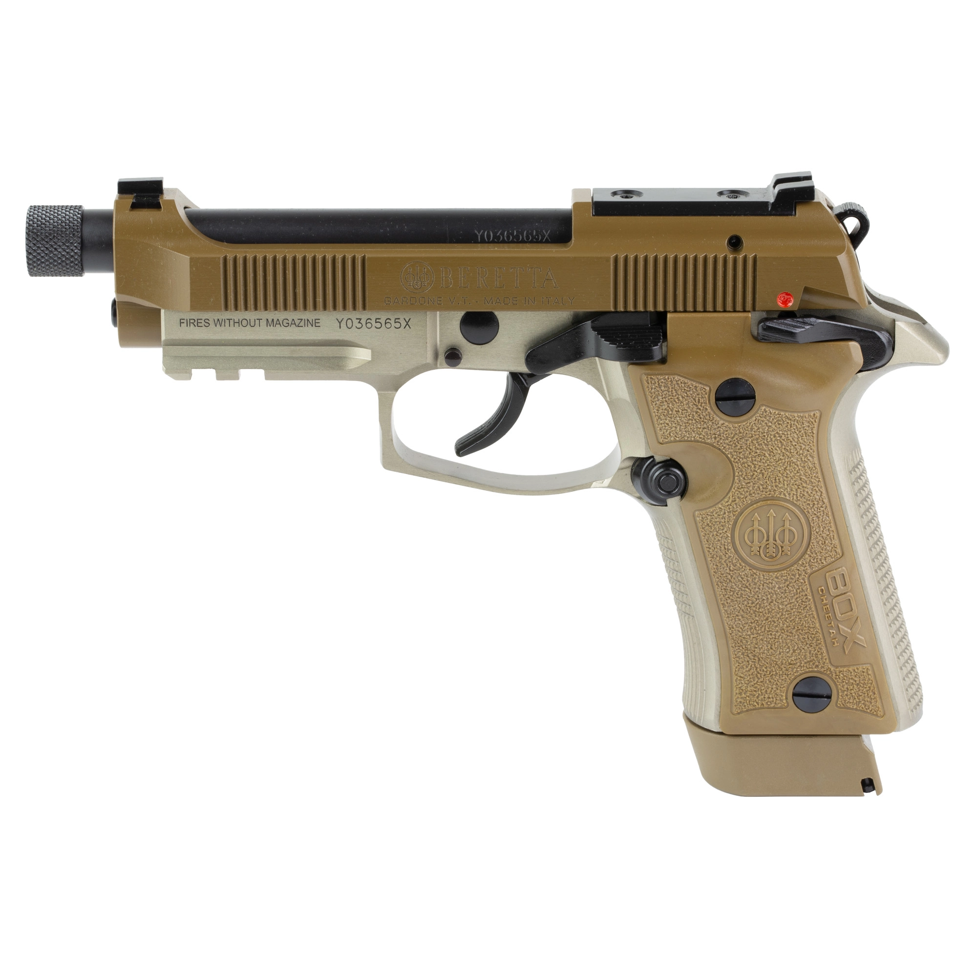 Beretta 80X Cheetah Tactical, Double Action/Single Action, Semi-automatic, Metal Frame Pistol, 380ACP, 4.4″ Threaded Barrel, Polymer Grip, Manual Safety/Decocker, Matte Finish, Desert, Front Picatinny Rail, Optic Ready, 15 Rounds, 2 Magazines J80XTD15