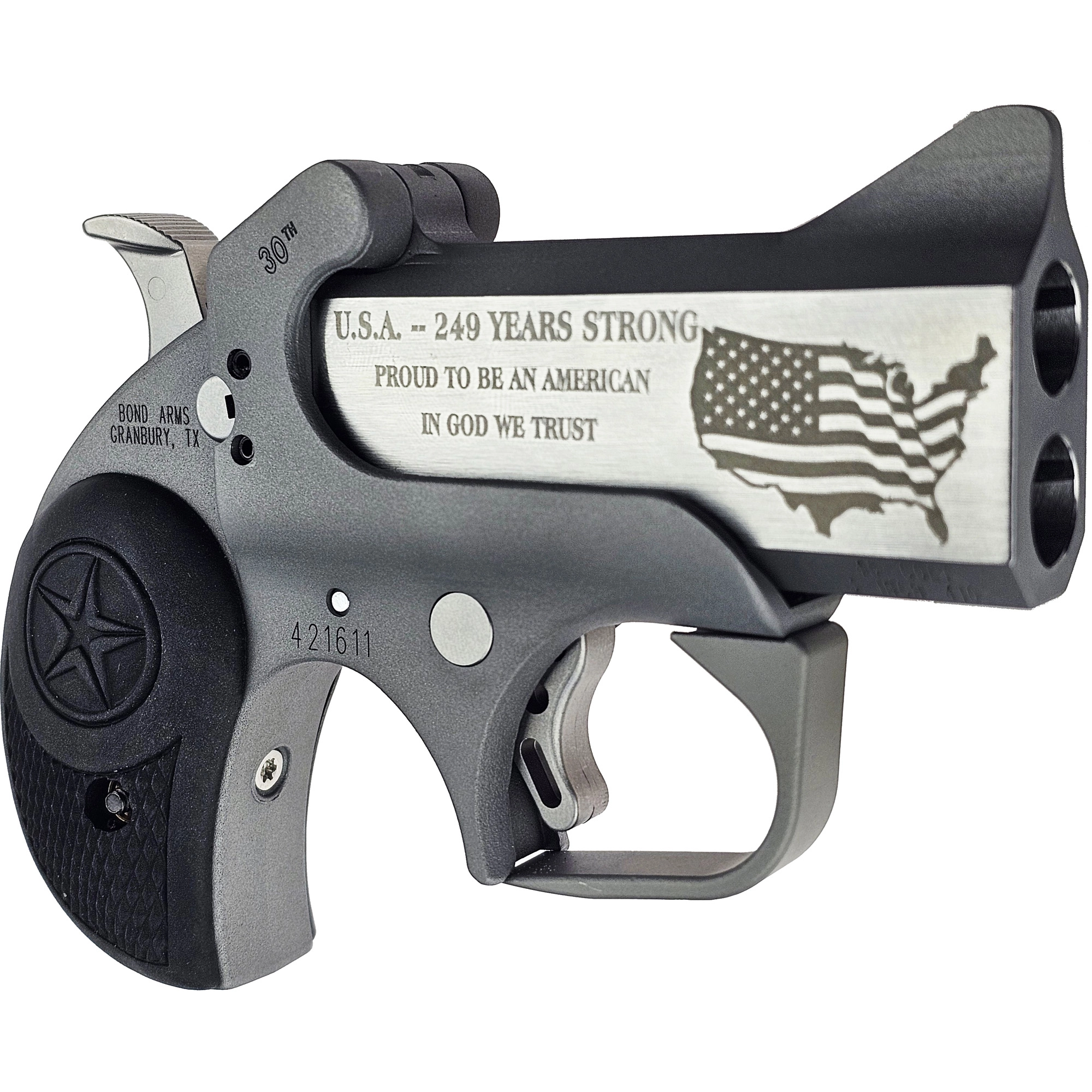 Bond Arms 30th Rough Series, Derringer, 45 Colt/410 Bore, 2.5″ Chamber, 3″ 30th Anniversary Engraved Flat Barrel, Stainless Steel, Silver, Black Rubber Grips, Fixed Sights, 2 Rounds, With Trigger Guard BA30TH-45LC-410
