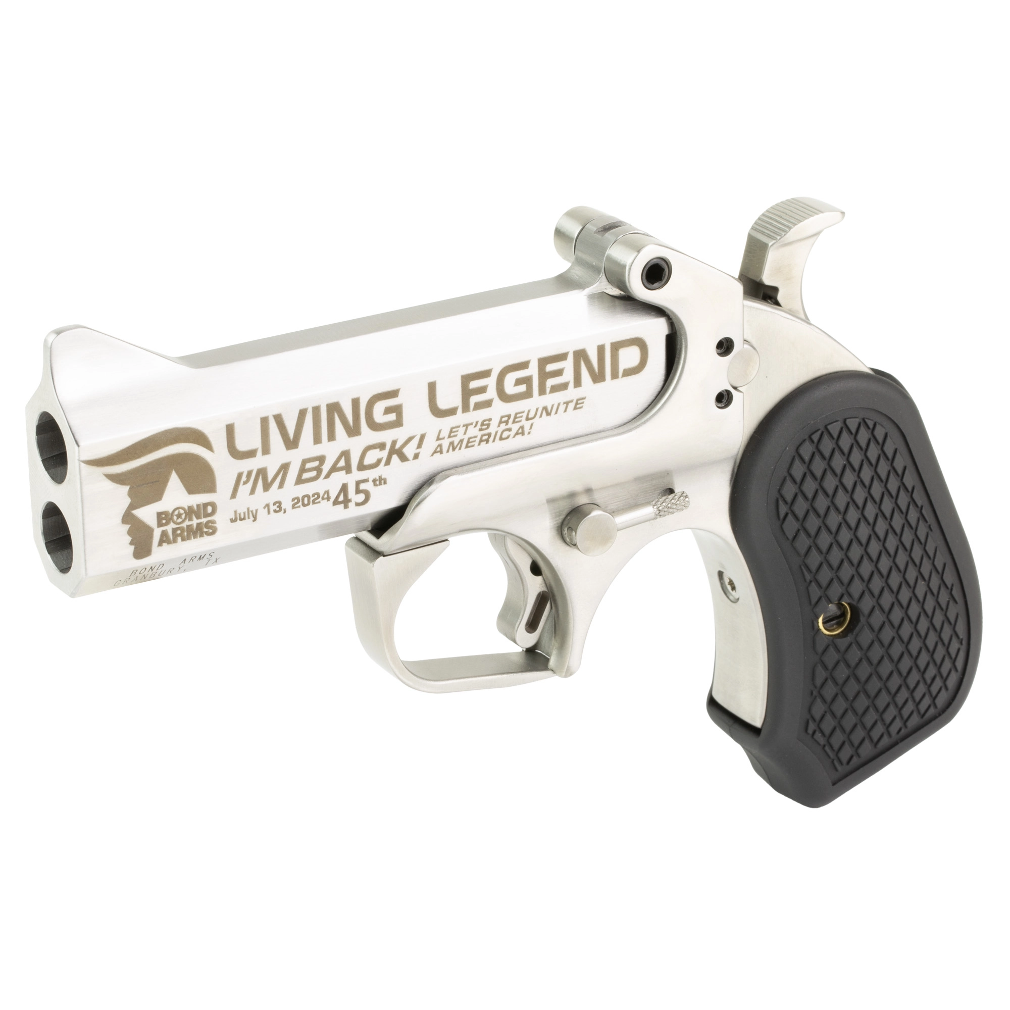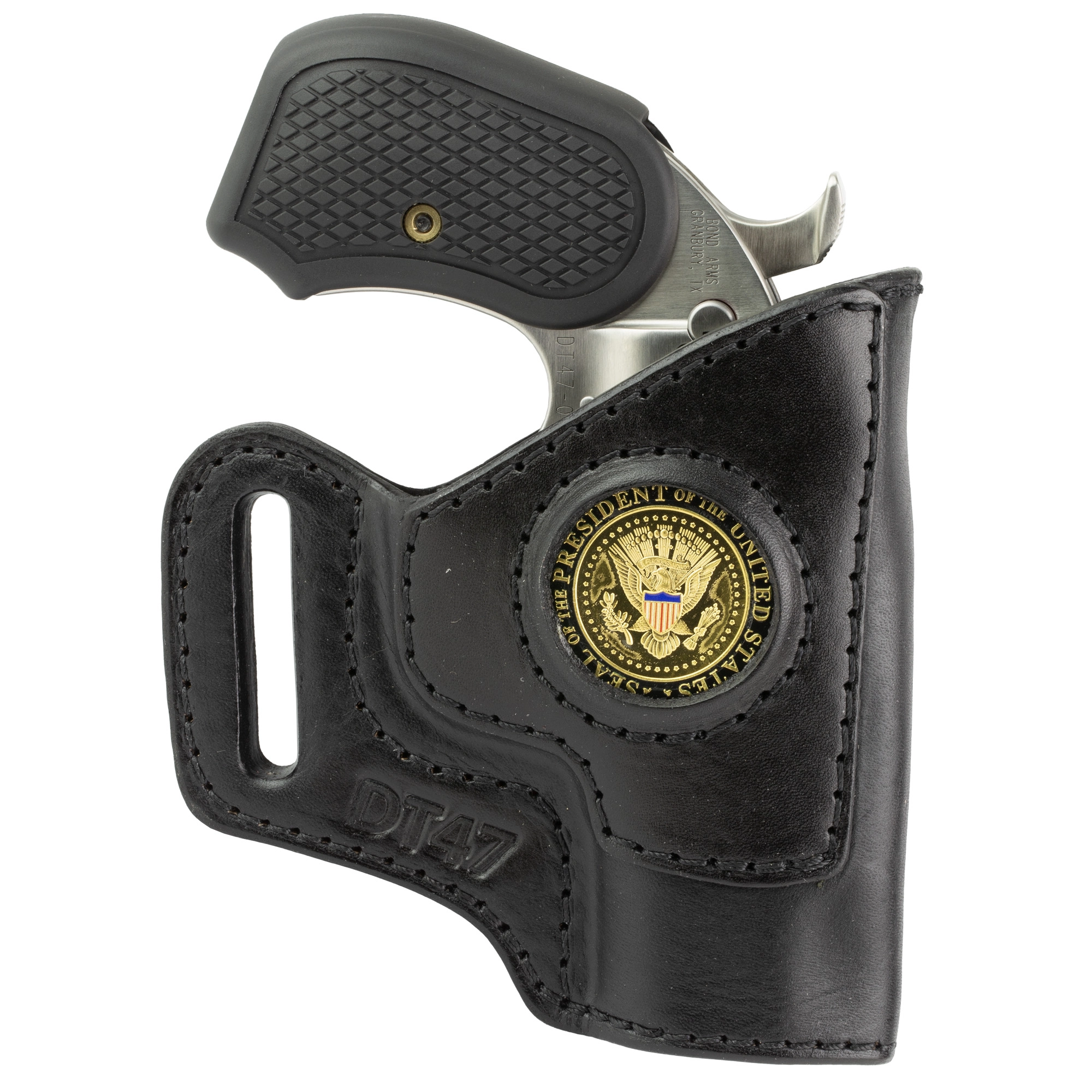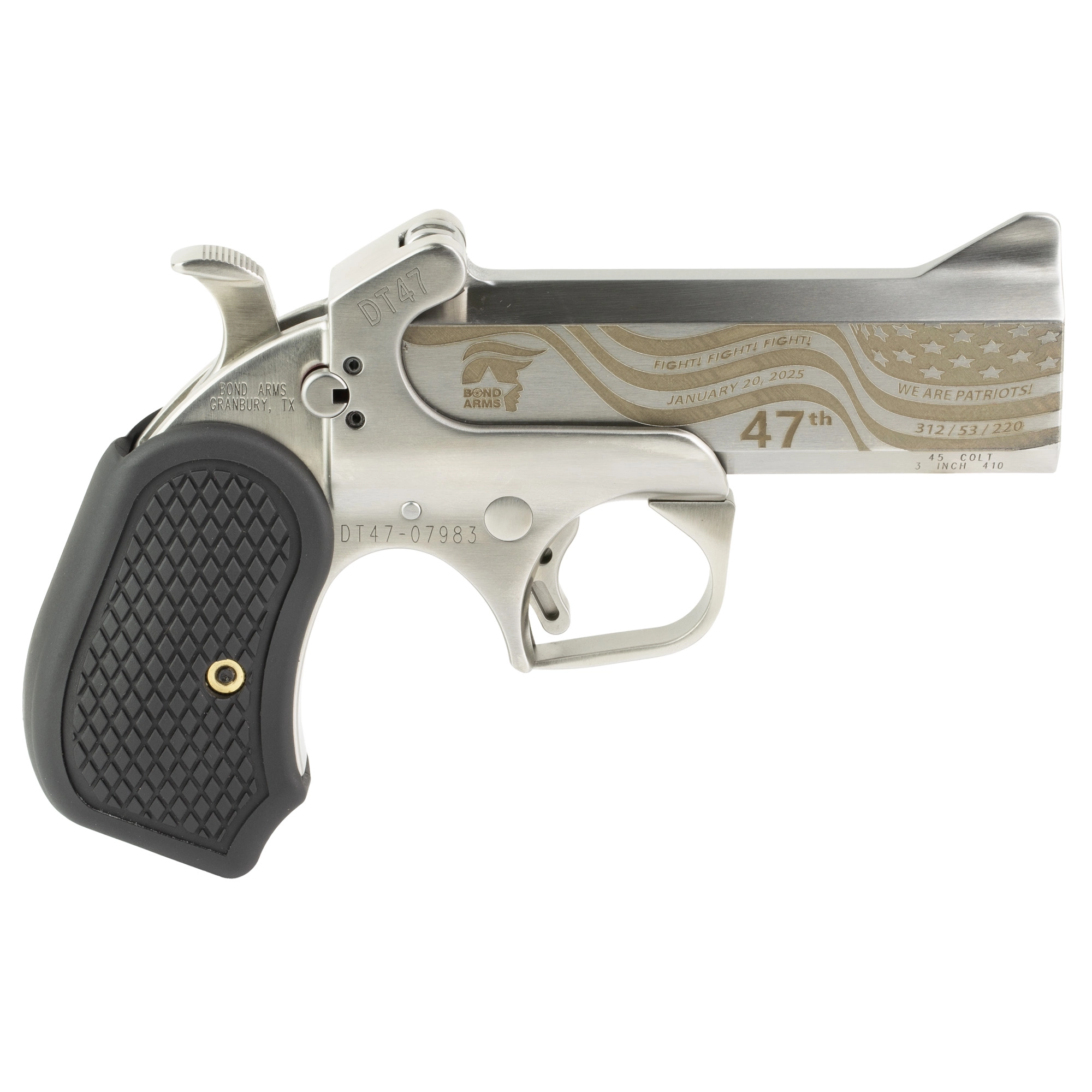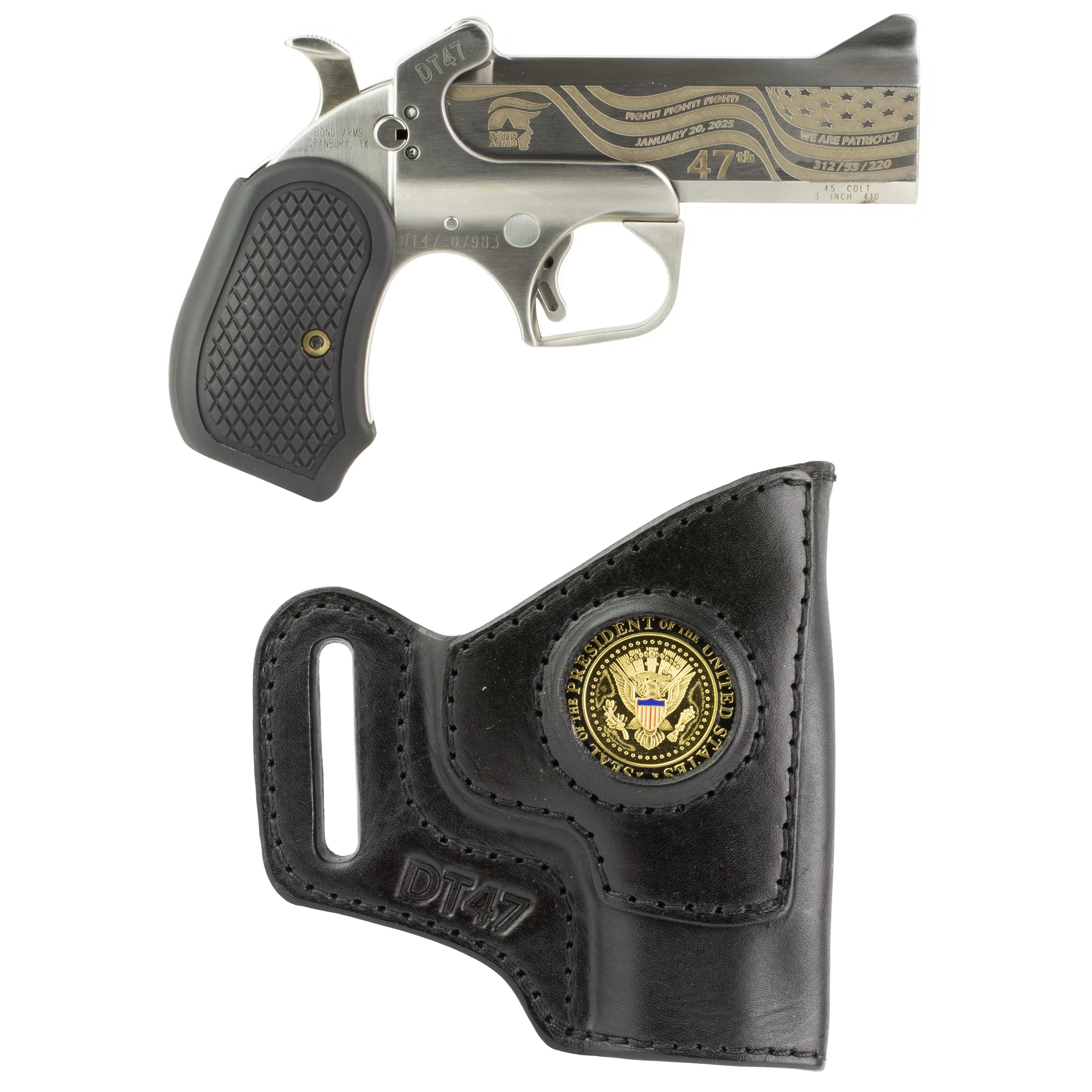 Bond Arms DT47 Satin Package, 45 Colt/410 Bore, 3″ Chamber, 4.25″ Barrel, Steel Construction with Trigger Guard, Satin Finish, Silver, Extended Resin Grips, Fixed Sights, 2 Rounds, Includes Holster BADT47-Satin Pkg