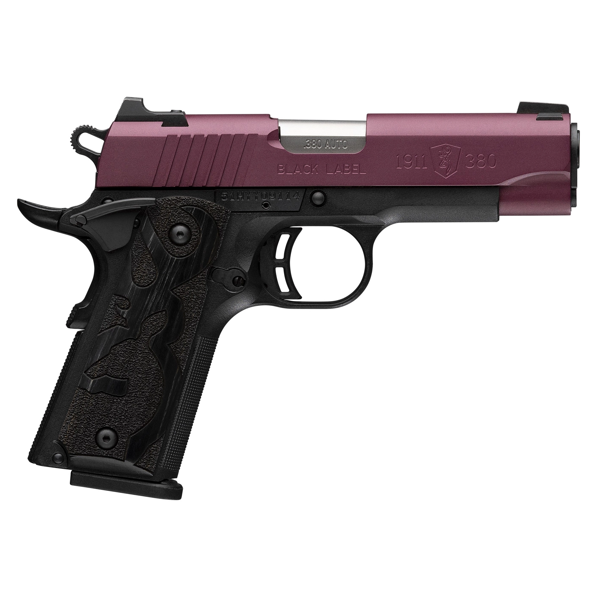 Browning Black Label, 1911, Single Action, Semi-automatic, Metal Frame Pistol, Full Size, 380 ACP, 3.6 Barrel, Cerakote Finish, Black Cherry, Black Frame, Stippled Laminated Wood Grips, 3 Dot Sights, 10 Rounds, 2 Magazines 051995492