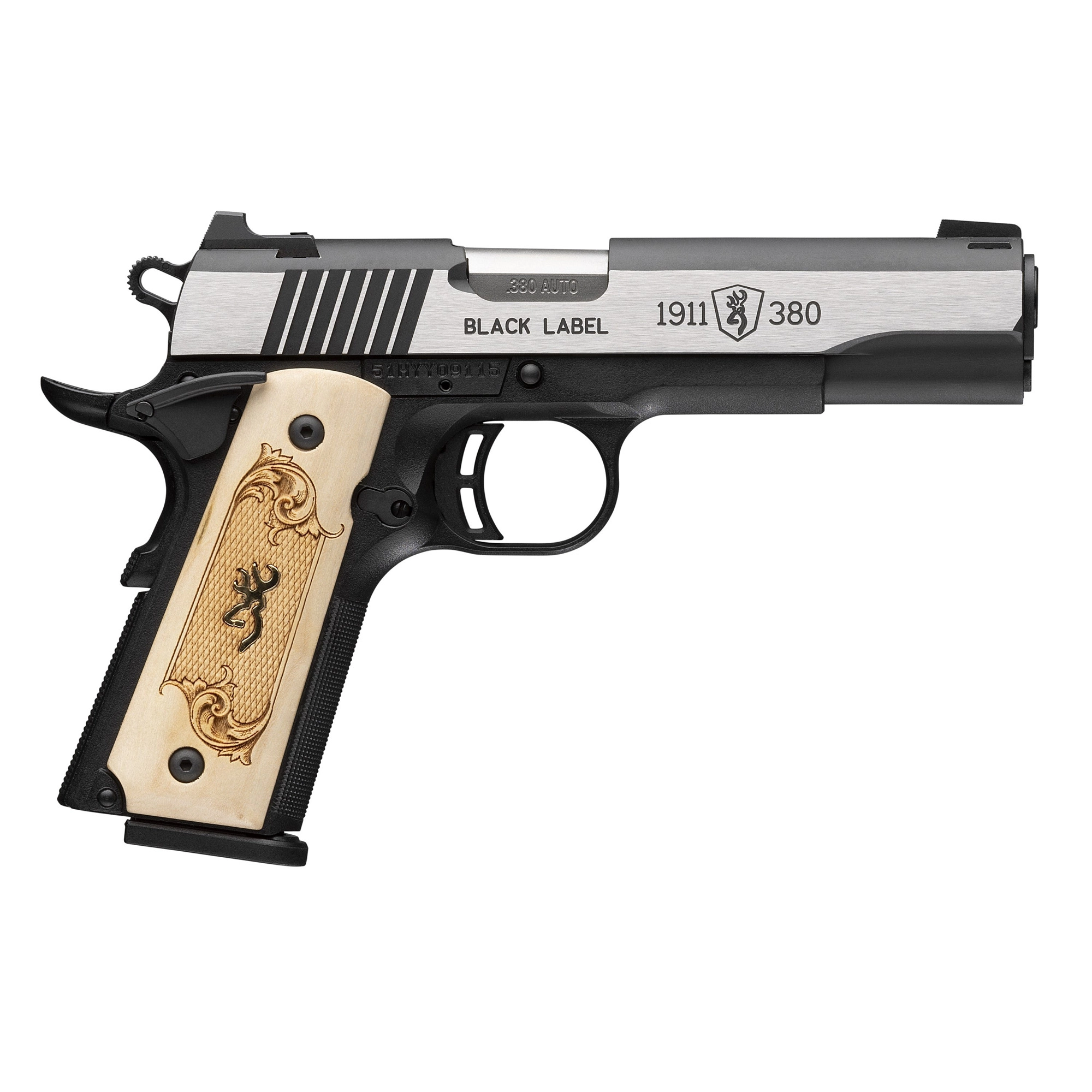 Browning Black Label, 1911, Single Action, Semi-automatic, Metal Frame Pistol, Full Size, 380 ACP, 4.25″ Barrel, Stainless Finish, Silver, Black Frame, Maple Medallion Checkered Grips, 3 Dot Sights, 10 Rounds, 2 Magazines 051998492