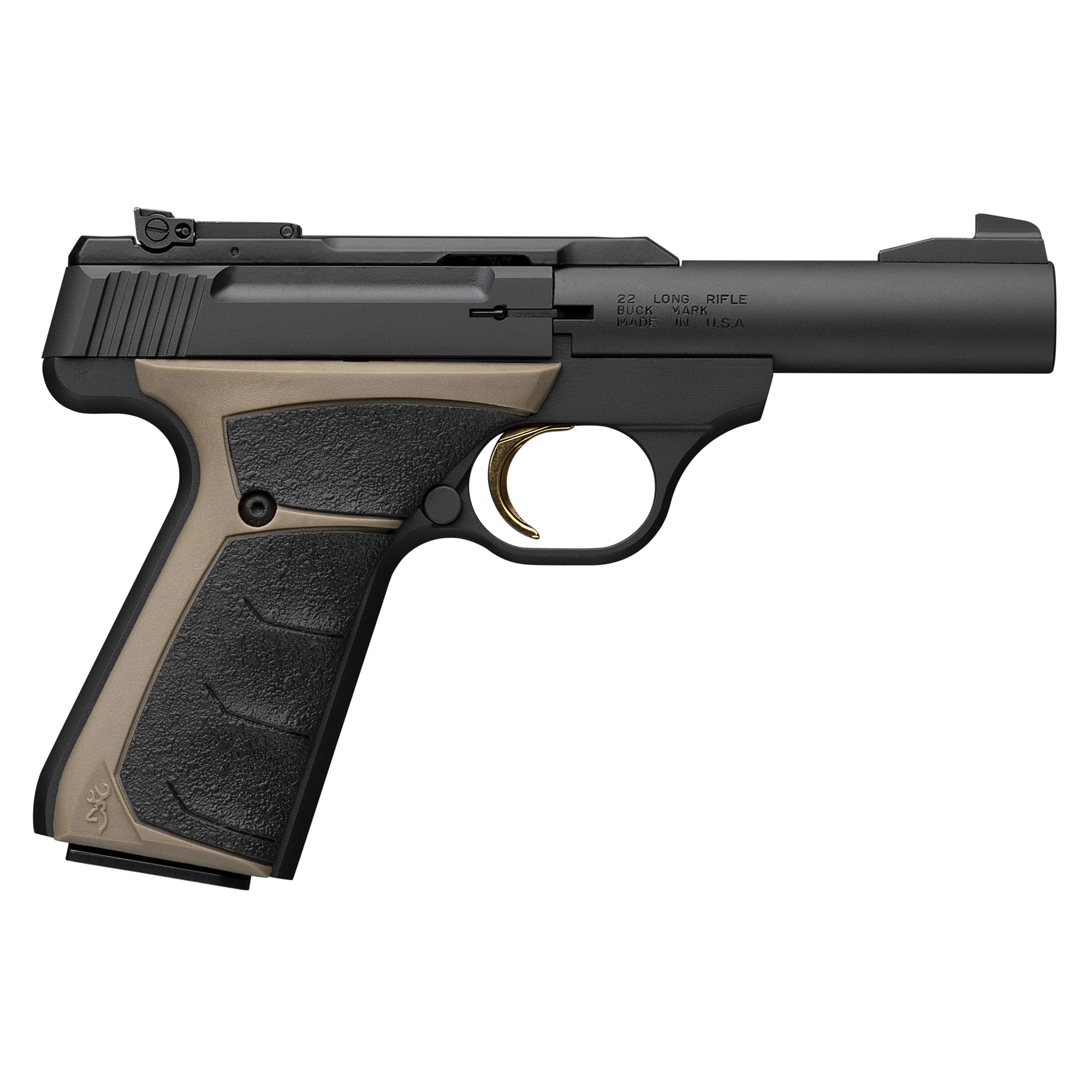 Browning Buck Mark Micro Bull, Semi-automatic, Metal Frame Pistol, 22 LR, 4″ Barrel, Flat Dark Earth/Black UFX Grips, Matte Finish, Black, Blade Front/Adjustable Rear Sights, 10 Rounds, 2 Magazines 051603490