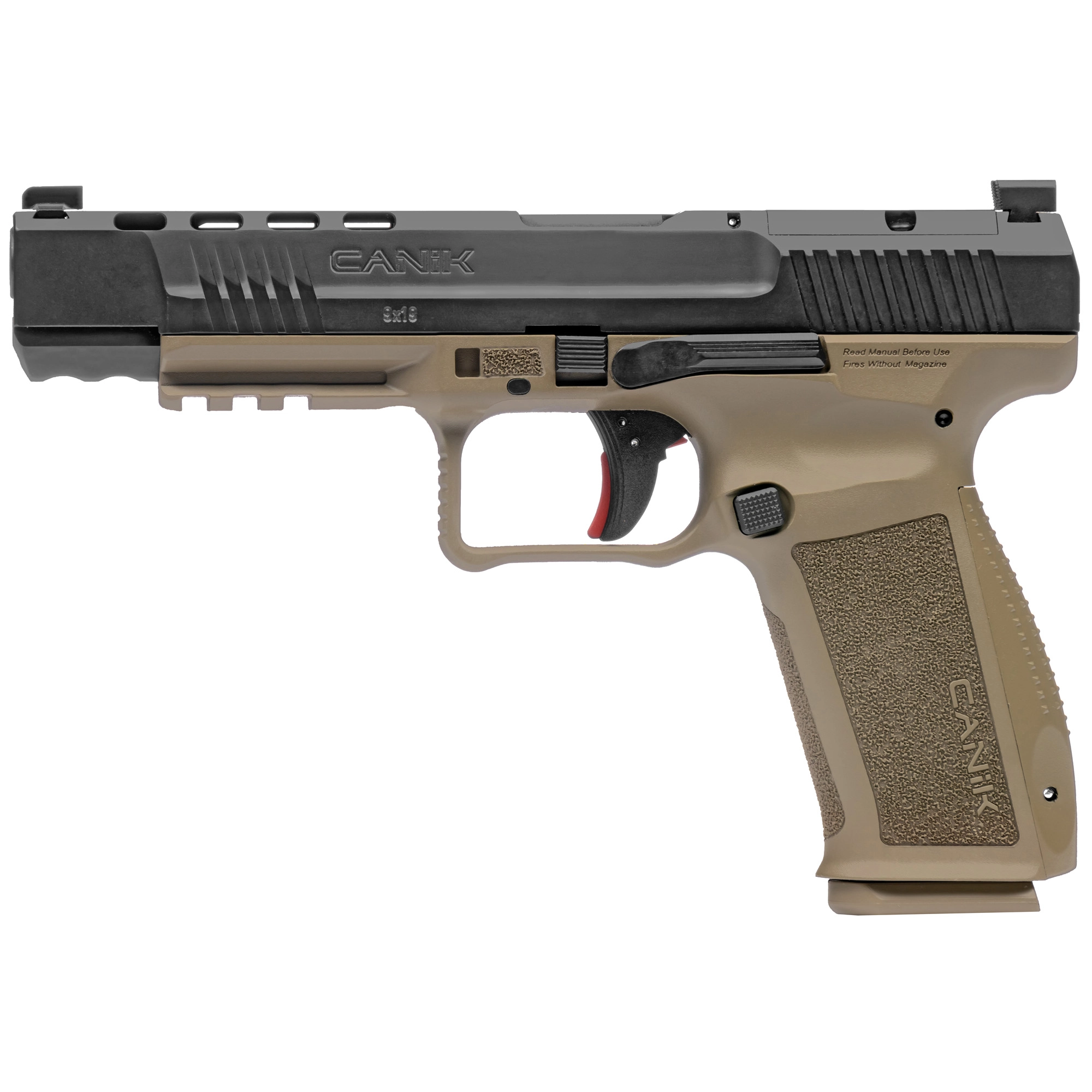 CANIK TP9, METE SFx, Striker Fired, Semi-automatic, Polymer Frame Pistol, Full Size, 9MM, 5.2″ Barrel, Black Slide, Tan Frame, 3 Dot White Sights, Flared Magwell, Holster Fit and Lock, Optic Ready, 2 Magazines, (1)-18 Round and (1)-20 Round HG5635-N