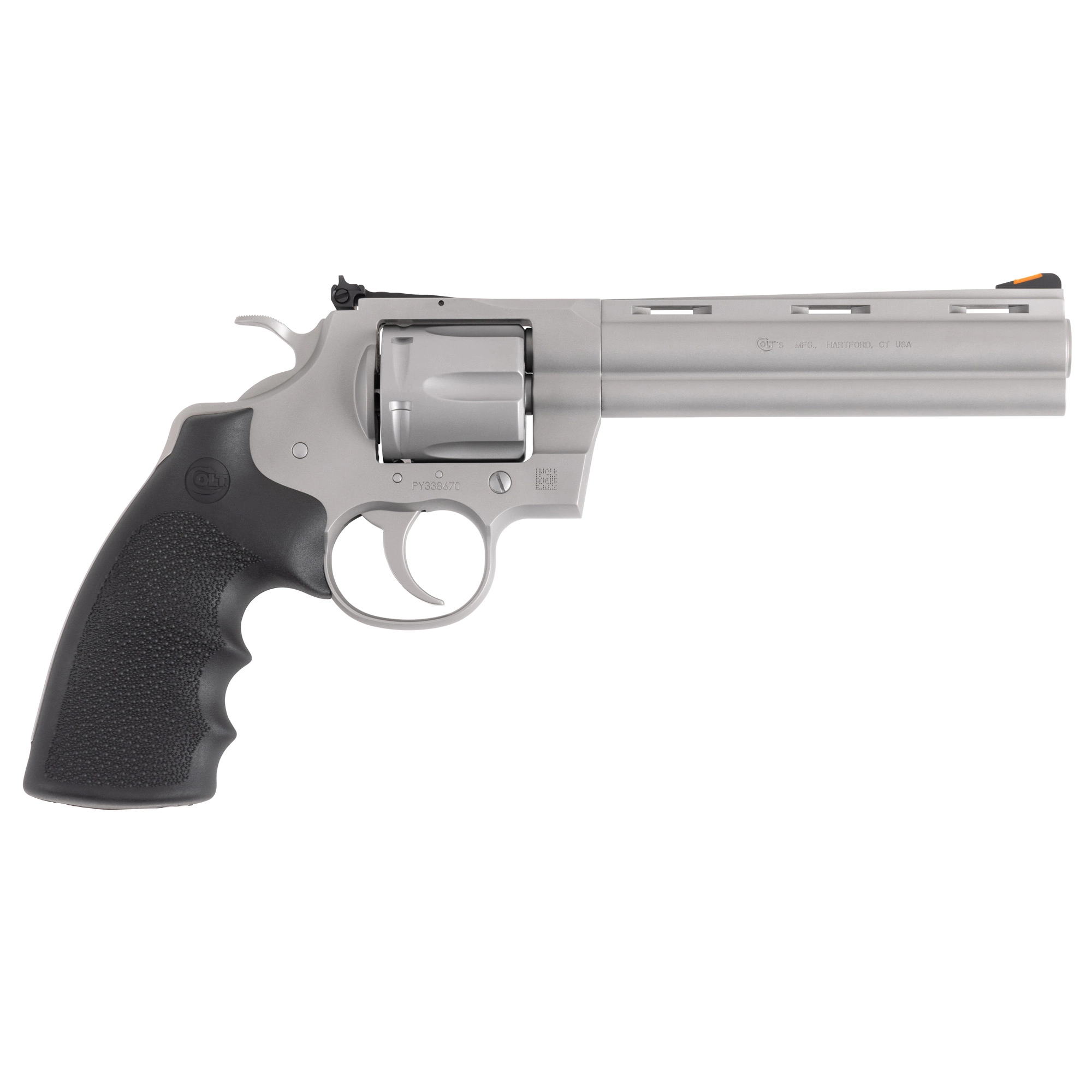 Colt’s Manufacturing Python, Double/Single Action, Steel Frame Revolver, 357 Magnum/38 Special, 6″ Barrel, Stainless Steel, Bead Blast Finish, Black Hogue Rubber Grips, Blade Front/Adjustable Rear Sights, 6 Rounds PYTHON-SM6RTS