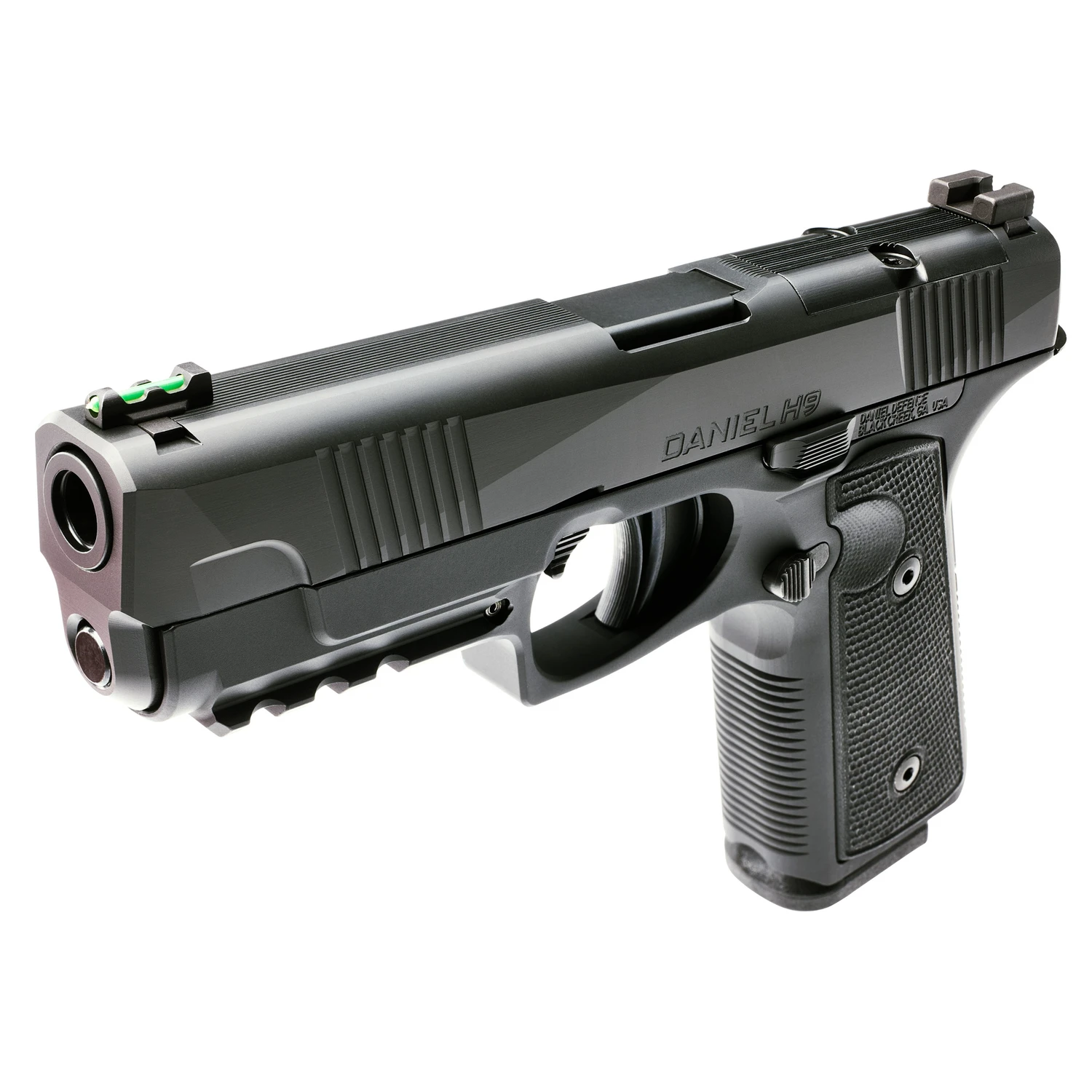 Daniel Defense DANIEL H9, Striker Fired, Semi-automatic, Metal Frame Pistol, Full Size, 9MM, 4.28″ Barrel, Anodized Finish, Black, Fiber Optic Front Sight, Black Out U-Notch Rear Sight, STANAG 4694 Accessory Rail, Optic Ready Slide, 15 Rounds, 2 Magazines 50-179-10084-006