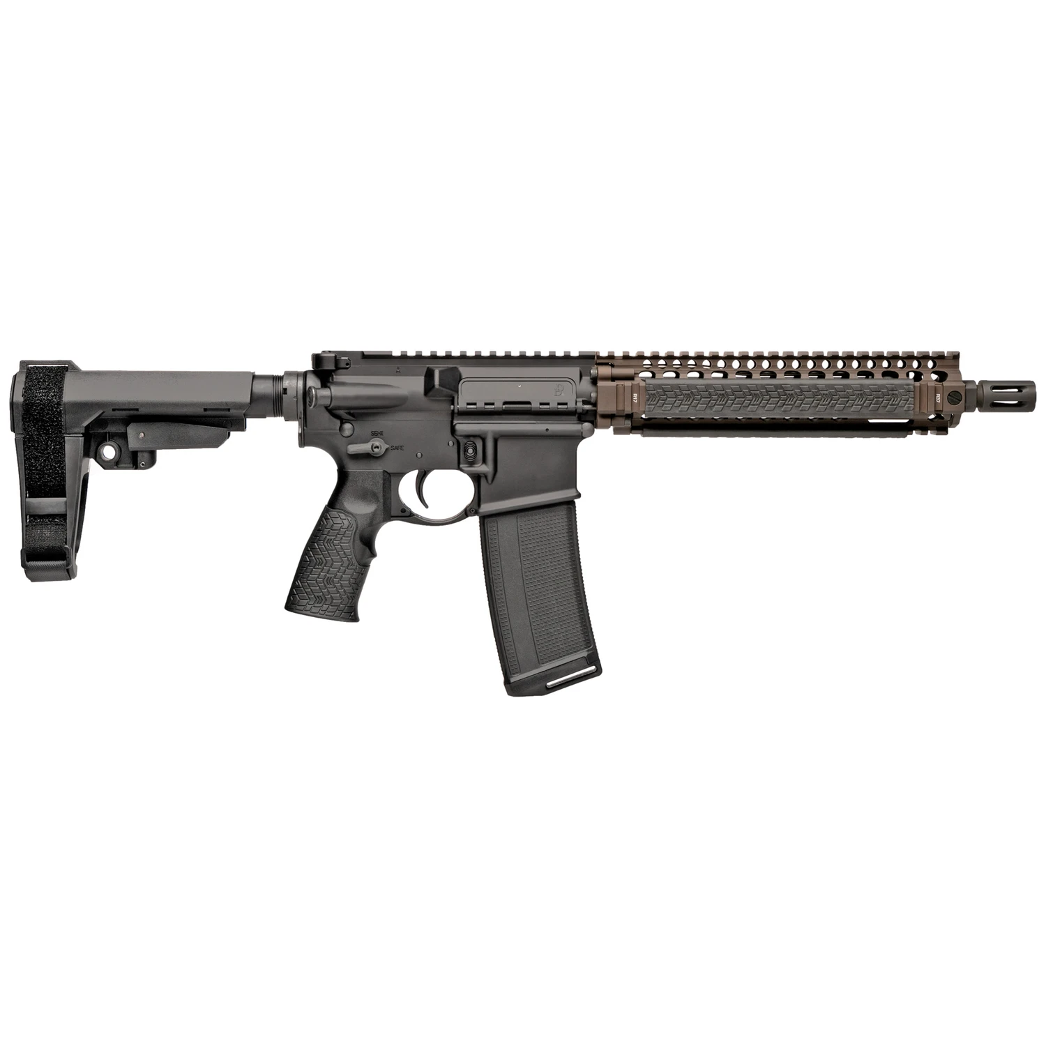 Daniel Defense MK18, Semi-automatic, AR Pistol, 556NATO, 10.3″ Cold Hammer Forged Barrel, FDE Anodized Finish, Daniel Defense Pistol Grip, SBA3 Pistol Stabilizing Brace, Ambidextrous Safety, RIS II Handguard, Grip-N-Rip Charging Handle, Daniel Defense Rail Panels, 1 Magazine, 32 Rounds 02-088-06030