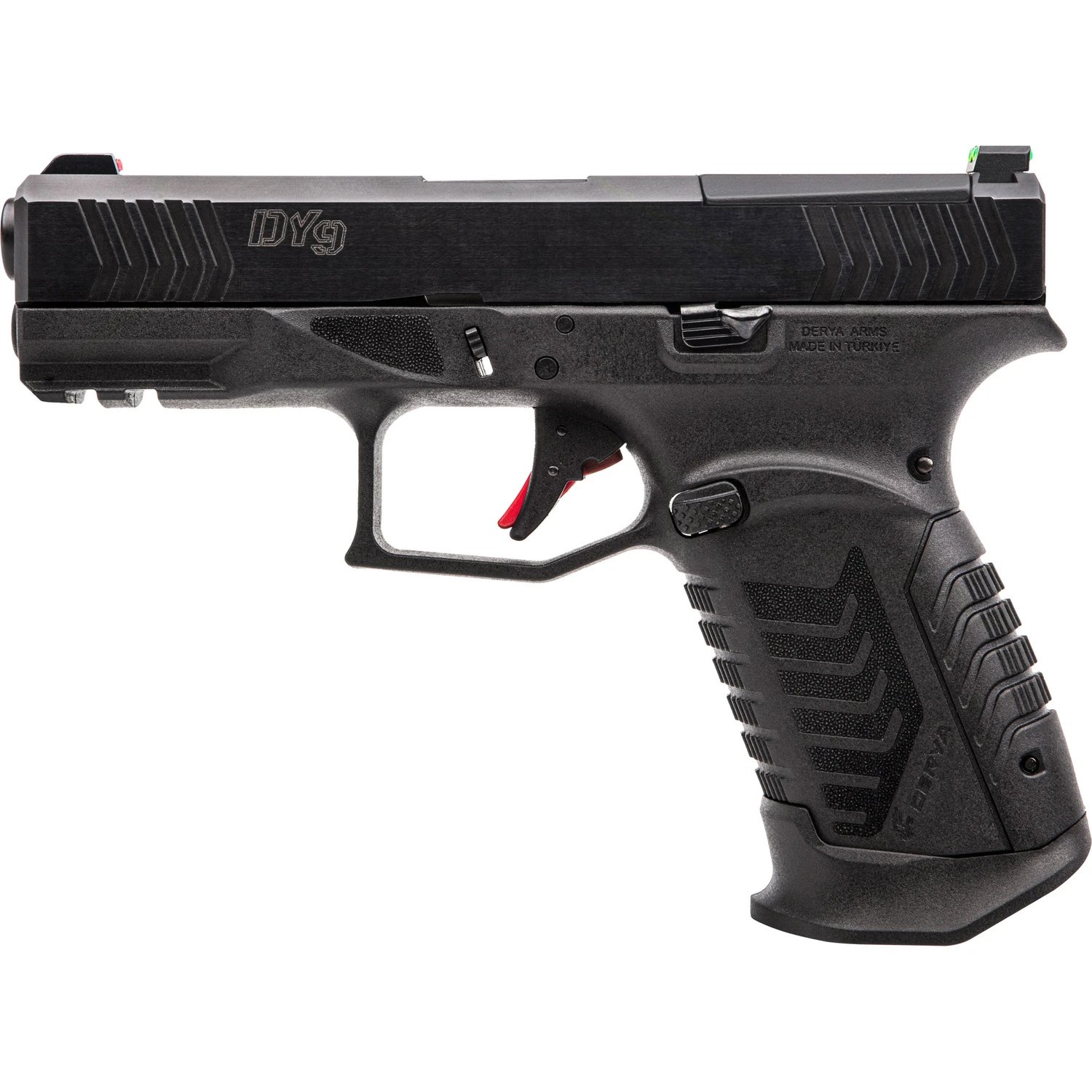 Derya DY9, Striker Fired, Semi-automatic, Polymer Frame Pistol, Full Size, 9MM, 3.86″ Barrel, Melonite Finish, Black, Truglo Fiber Optic Front and Rear Sights, Optics Ready Slide, Glock Magazine Compatible, 10 Rounds, 1 Magazine, Includes (2) Optic Plates & (4) Back Straps 10L.DY9.US