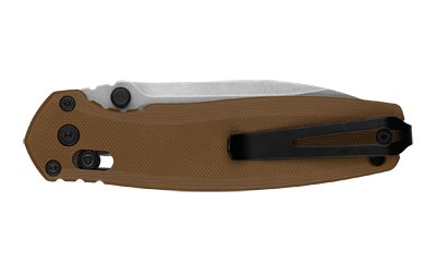 As its name implies, the Broadside is a versatile cutting tool on the job. The spear point blade features D2 blade steel and a saber grind for greater versatility. A tan G10 handle fills the hand comfortably, offering a firm grip for extended work. Activate with the thumb stud for reliable and smooth KVT deployment. Ultra-secure DuraLock technology locks the blade in place. Slide back the handle button to safely close the blade and carry the Broadside with a reversible deep-carry pocket clip. Whether you work in a trade or tackle home projects, the beefy Broadside will not let you down.