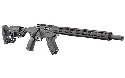 Molded, one-piece chassis and adjustable buttstock assembly are manufactured with glass-filled nylon for strength, stiffness and stability, making a solid foundation for accuracy each and every shot. Adjustable buttstock features a flat Picatinny bag rider making it easy to affix a rear monopod. A molded-in window provides a tether point for your squeeze bag, and a metal QD pocket makes it easy to secure a sling. Quick-Fit adjustable Precision Rimfire stock allows length of pull and comb height to be quickly and easily adjusted to get proper fit over a wide range of shooter sizes, outerwear and shooting positions. Indicating marks molded into the chassis help you quickly return to a previous position. Big-Gun bolt throw adjustment enables shooters to change from a rimfire 1-1/2″ bolt throw to a short-action centerfire 3″ bolt throw, reducing the chance of short-stroking your bolt in competition. Ruger Marksman Adjustable trigger is externally adjustable, with a trigger pull range of 2.25 to 5 pounds; wrench is stored in a buttstock compartment. Ruger’s own AR-Pattern pistol grip and safety selector provides an extended reach for maximum control and access to the 45 degree, reversible safety selector. May be configured with most AR-style grips and selectors. Anodized 0 MOA Picatinny scope base makes it easy to mount and zero optics. Oversized bolt handle for positive bolt manipulation (same as the Ruger Precision Rifle). 15″ aluminum free-float handguard is black hard-coat anodized aluminum and features Magpul M-LOK slots on all four sides for improved scope clearance for long-range scopes and easy mounting of M-LOK-compatible rails and accessories. Target barrel is cold hammer-forged from 1137 alloy steel to create ultra precise rifling for excellent accuracy. Barrel can be replaced easily by a competent gunsmith using AR-style wrenches and headspace gauges. 1/2″-28 threaded barrel for standard muzzle accessories, like the Silent-SR suppressor, comes with a factory-installed thread protector covering both the threads and crown. Accepts Ruger magnum rimfire magazines, including the JMX-1 rotary magazine and the BX-15 Magnum magazine. Also includes: one, 15-round BX-15 Magnum magazine.