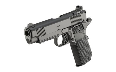 The slim profile of the 1911 TRP is now complemented by a lightweight aluminum Carry Contour frame and a 4.25″ barrel. Finished in black Cerakote, the bobbed portion of the frame reduces potential printing while maintaining a comfortable grip. Typically reserved for custom firearms, the TRP features 20 line-per-inch (LPI) checkering for a firm grip as well as top slide serrations for reduced glare and faster sight alignment. Now enhanced with the Agency Optic System (AOS), the TRP supports a wide range of popular optics, including RMR, Shield, Delta Point Pro, and Docter. Each AOS plate integrates a black serrated rear sight that ensures optimal optic height and an intuitive sight picture, enabling visible co-witnessing in nearly all configurations.